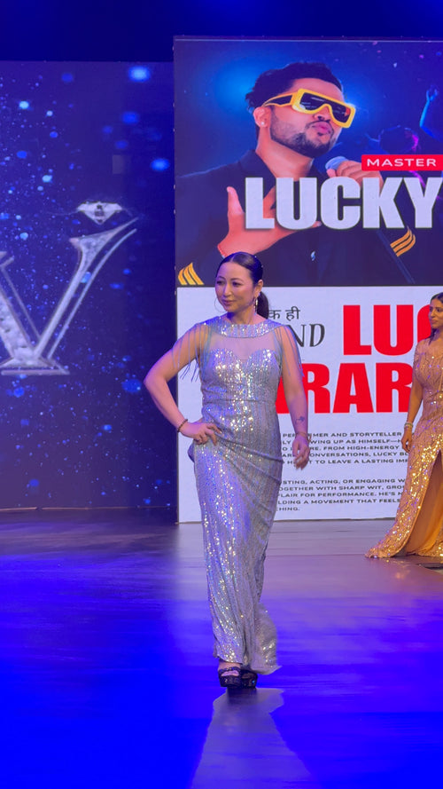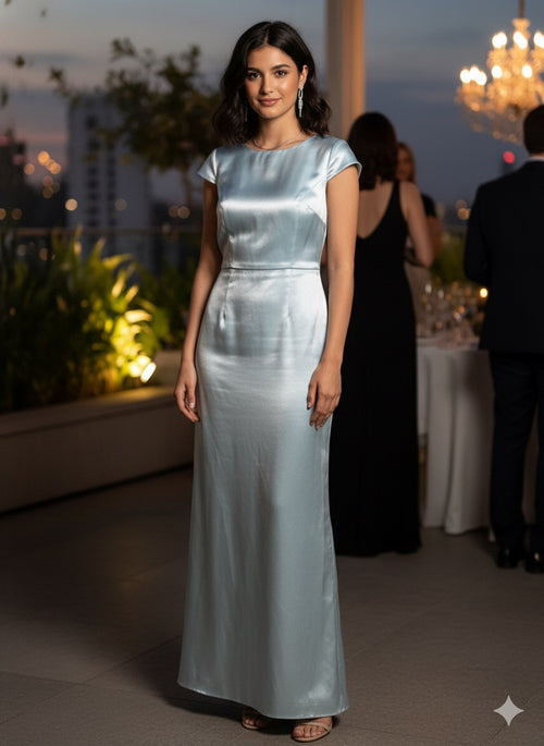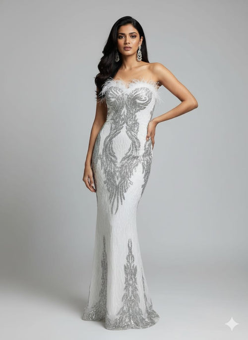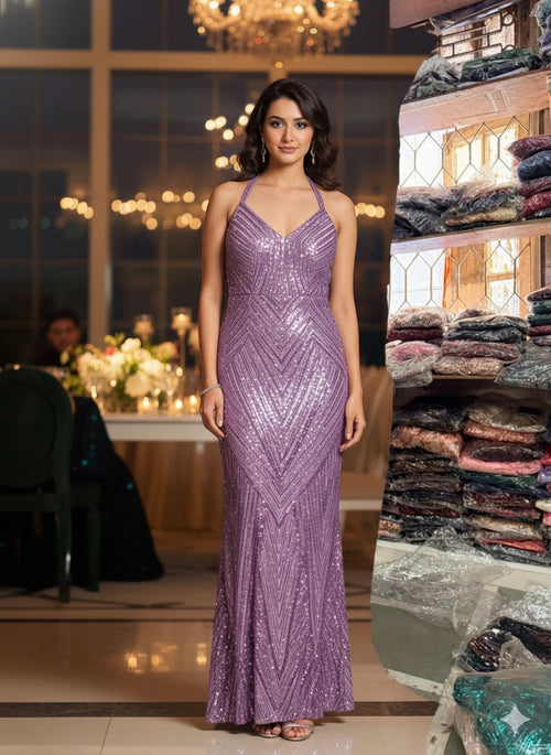 Powder Blue Sequin & Fringe Column Maxi Gown