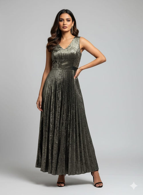 Olive Green Velvet V-Neck Pleated Maxi Dress